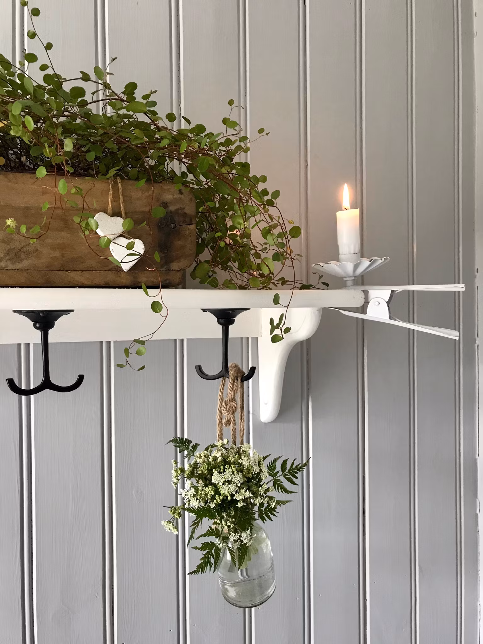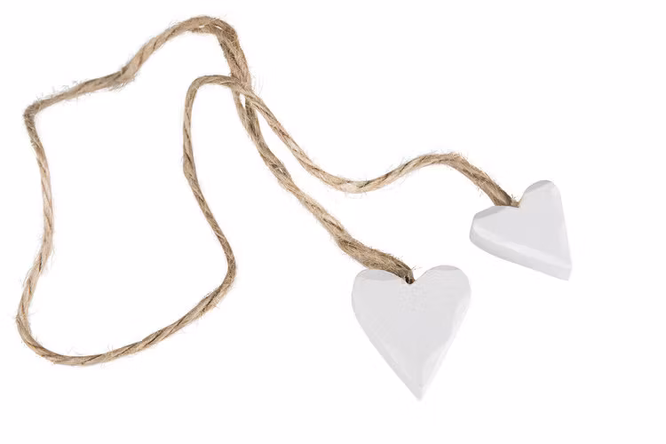 Små vita trä hjärtan på snöre, ett i var ända. Det ena är lite större än det andra. Fint att pynta, pyssla och dekorera med.