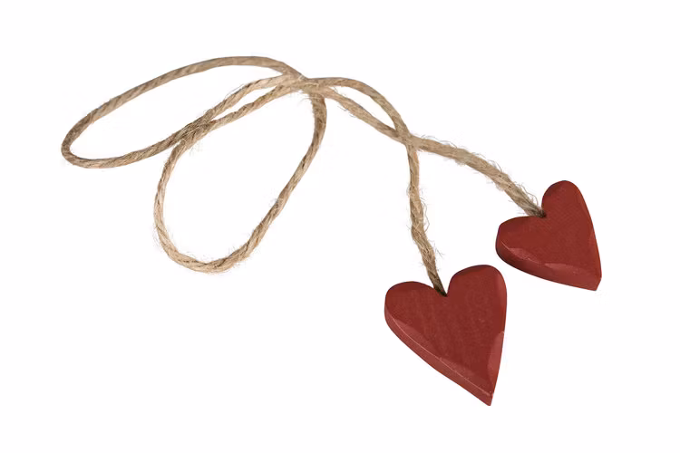 Små röda trä hjärtan på snöre, ett i var ända. Det ena är lite större än det andra. Fint att pynta, pyssla och dekorera med.