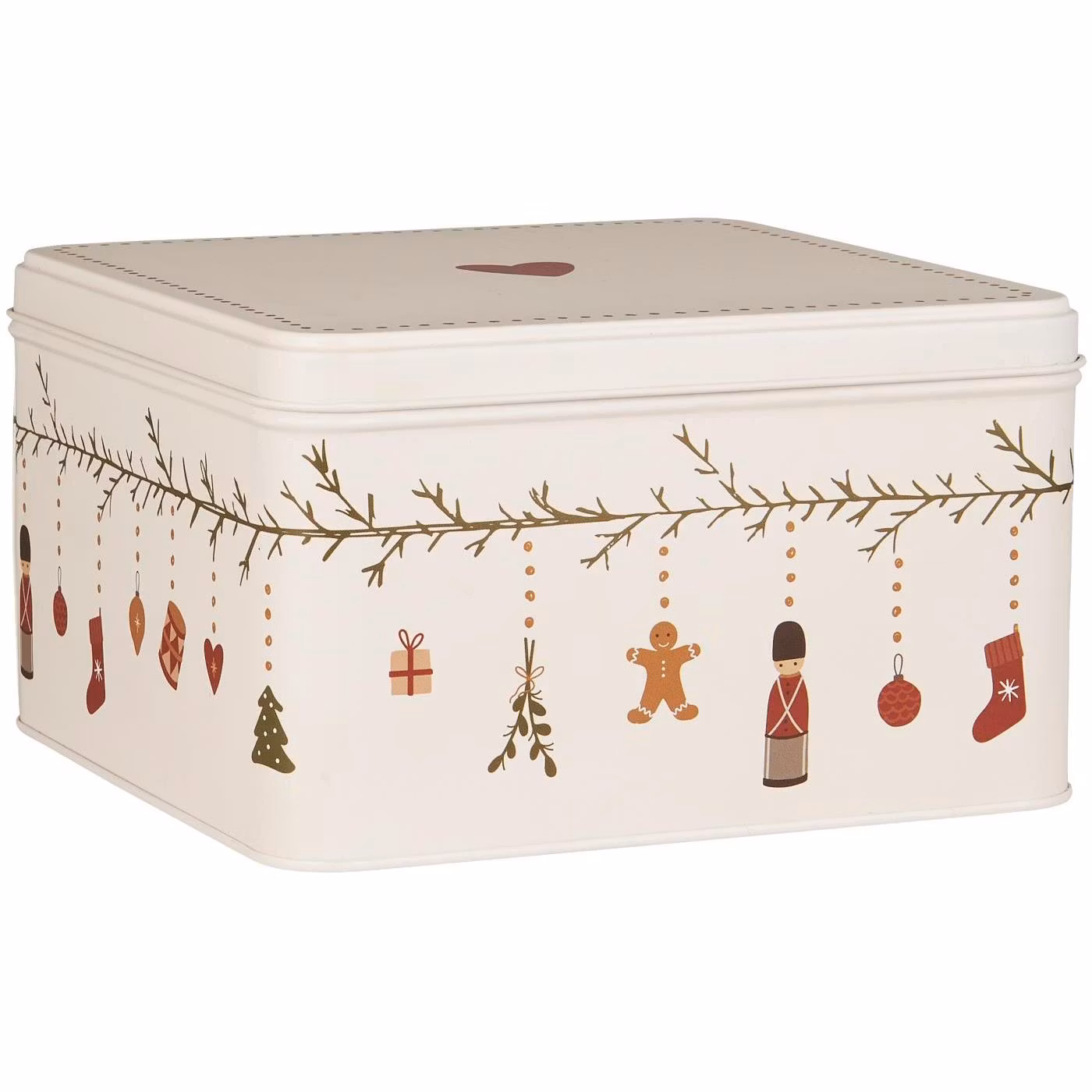 En söt plåtburk med julmotiv, perfekt att förvara julgodis eller julkakor i. En fin burk som blir en fin dekoration i köket under hela julen.