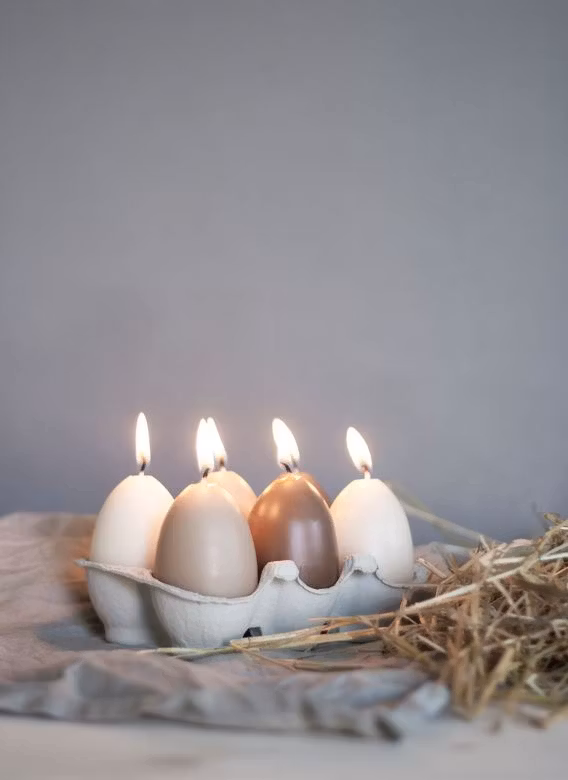 Naturtrogna äggljus, hönsägg i naturlig storlek. Passar att ställa i äggkoppar eller på ett fat. Fint och stilrent påskpynt. De färgade ljusen har ingen gula i mitten. Priset avser ett ljus.